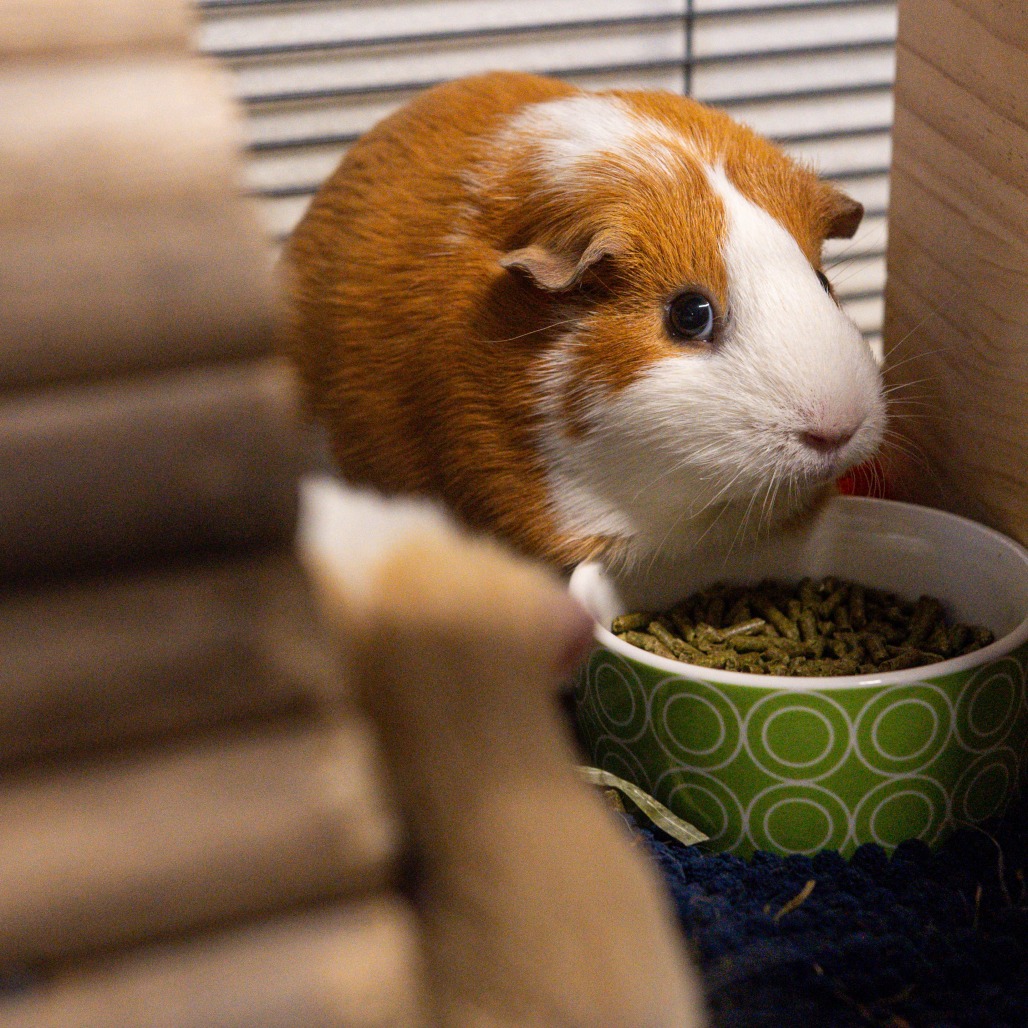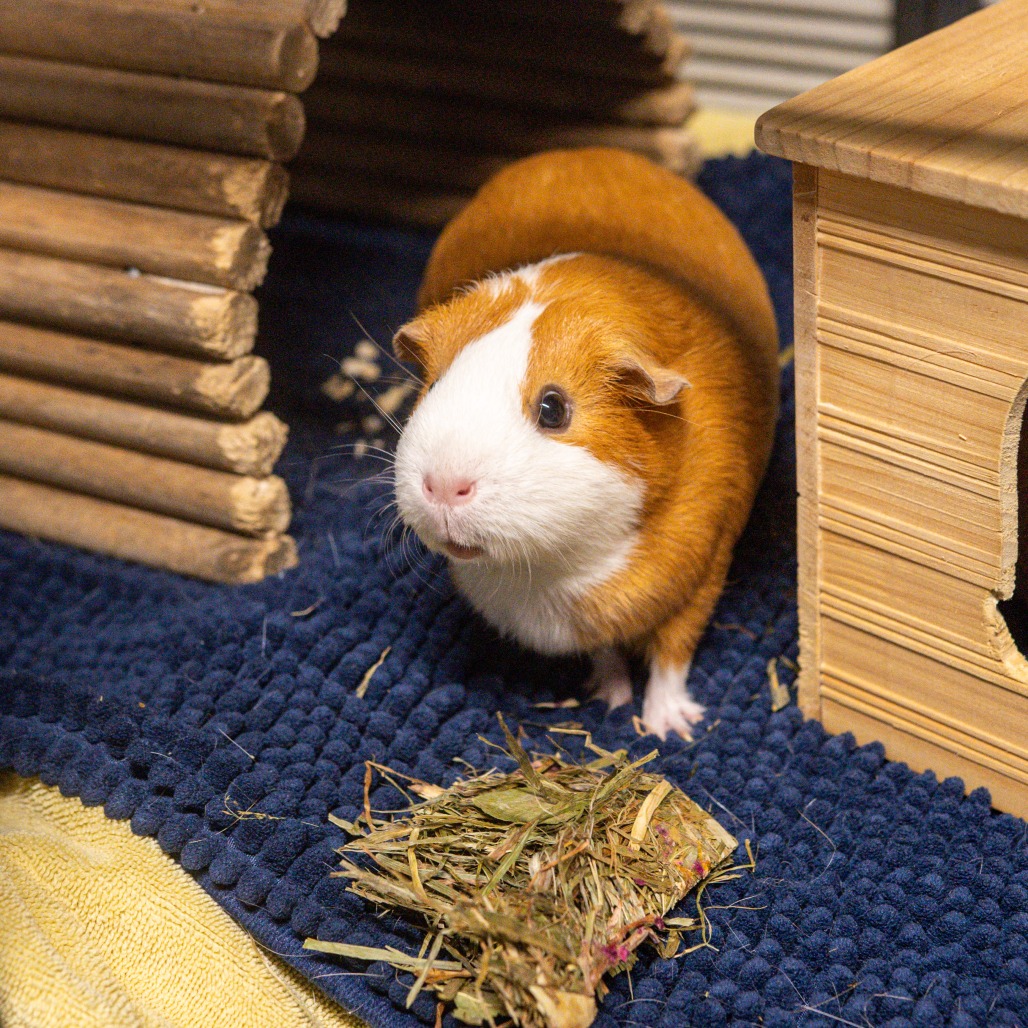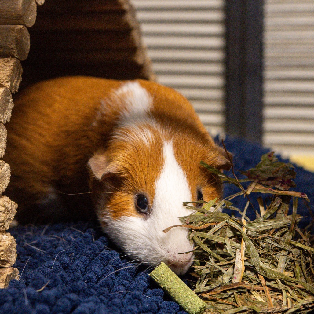 Like most guinea pigs, Ginger enjoys fresh veggies and hay daily, many huts and tunnels to play in, and time spent outside her enclosure for exercise and socialization. Guinea Pigs are such funny and unique animals who are smart, friendly, and make amazing companions to their people.