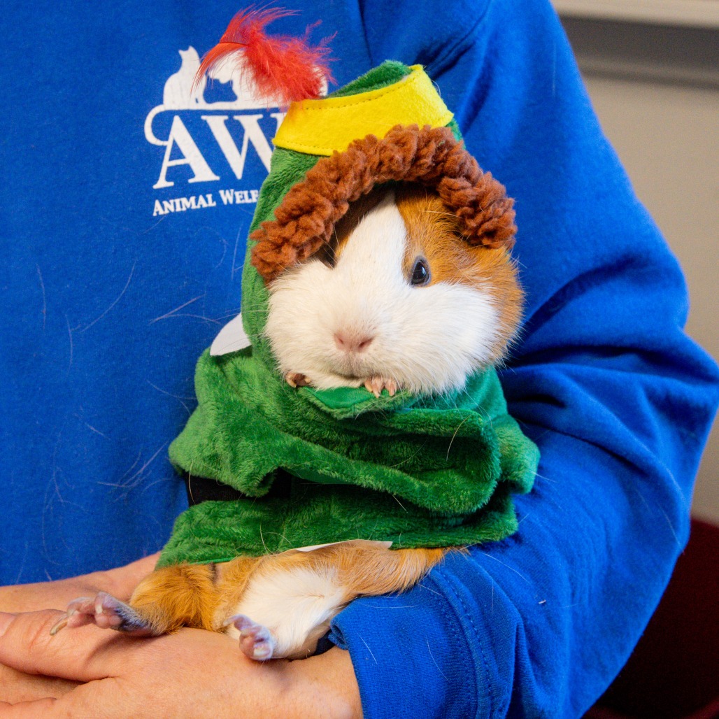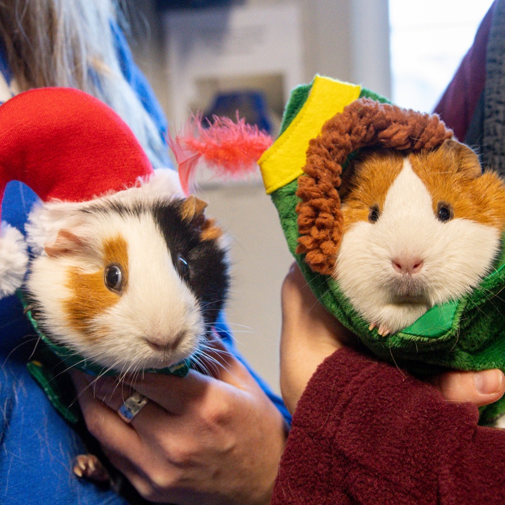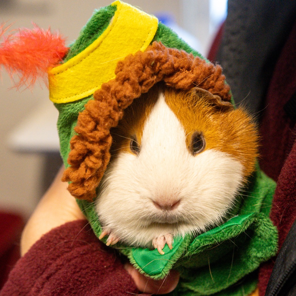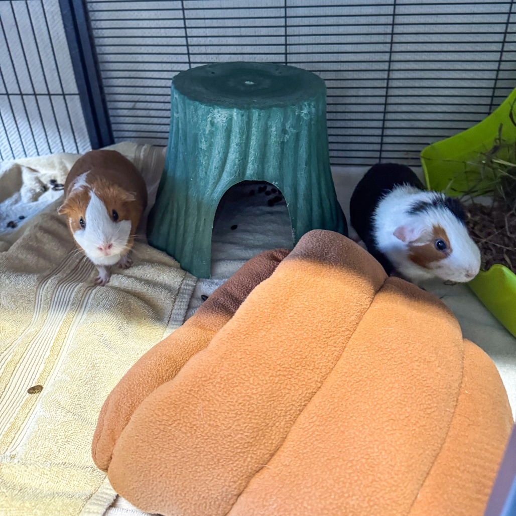Like most guinea pigs, Ginger enjoys fresh veggies and hay daily, many huts and tunnels to play in, and time spent outside her enclosure for exercise and socialization. Guinea Pigs are such funny and unique animals who are smart, friendly, and make amazing companions to their people.