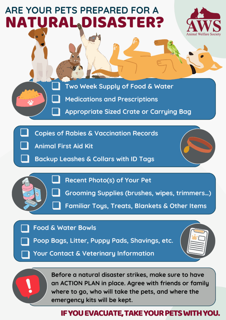 Bookmarking their websites and following them on social media is a great way to keep in touch during an emergency. These points of contact could help in a multitude of ways by providing information, safety, or resources for you and your pet during a disaster. Your County Animal Response Team (CART), part of your county’s emergency management agency may also offer resources. In times of great emergency, AWS partners with local emergency organizations to provide a safe haven for pets when their people must evacuate and enter a local emergency shelter.