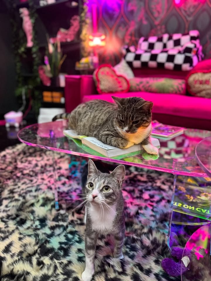 As I have loads of fun exploring everywhere and everything in our space, why not schedule an appointment to come say hi!? The Glitter Box is open 7 days a week from noon to 4 pm, with 30-minute short sesh or hour-long sesh options! Enjoy a cup of freshly brewed coffee and the company of lovely cats such as myself, and maybe even consider adopting! As they say at the Glitter Box: come for the coffee, stay for the cats, and leave with a smile (and maybe even a kitty)!